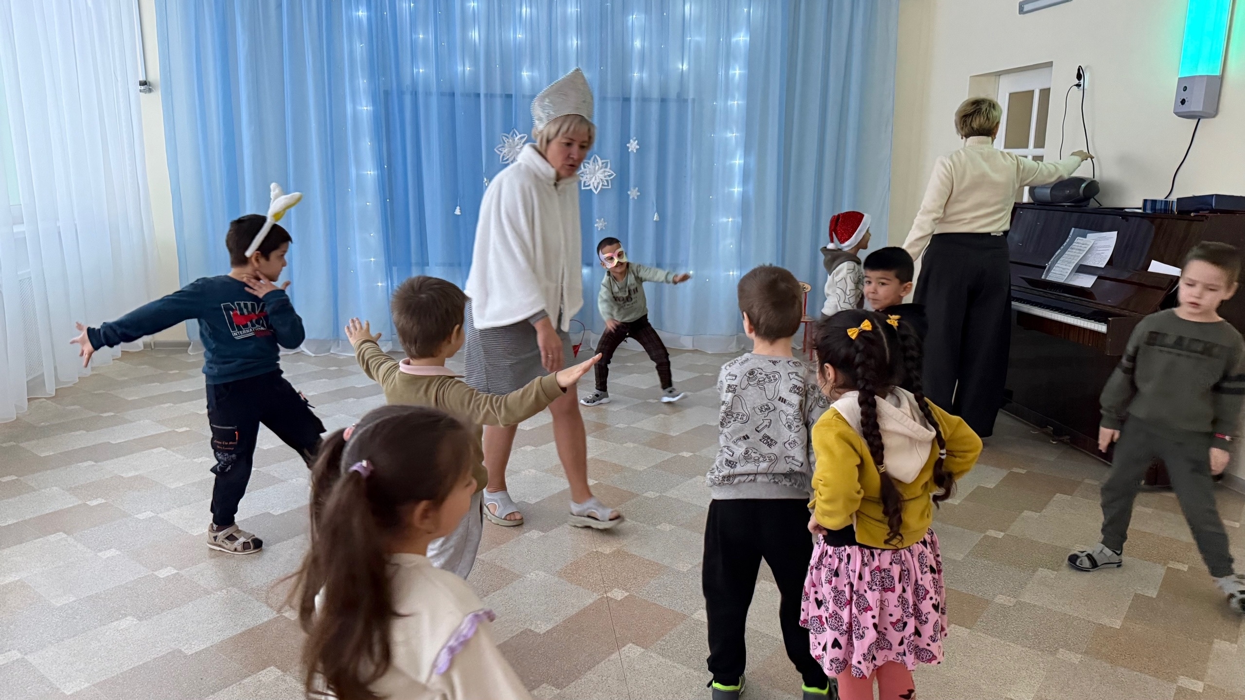Для Деда Мороза ребята подготовили стихи, которые читали с большим увлечением. Их голоса звучали ярко и эмоционально, создавая атмосферу настоящего праздника. Зимушка поддерживала детей, играя с ними в зимние игры, которые добавляли веселья и задора в мероприятие.